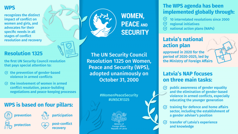 This was the first UN Security Council resolution to focus on the prevention of gender-based violence in armed conflicts and on the involvement of women in the resolution of armed conflicts, in peace-building negotiations and peacekeeping processes. The Ministry of Defence, the Ministry of the Interior, the Ministry of Welfare, and the Ministry of Education and Science are the institutions co-responsible for the implementation. Non-governmental organisations, especially the Resource Centre for Women MARTA and the Latvian Transatlantic Organisations (LATO) are providing invaluable contribution to carrying out the plan.