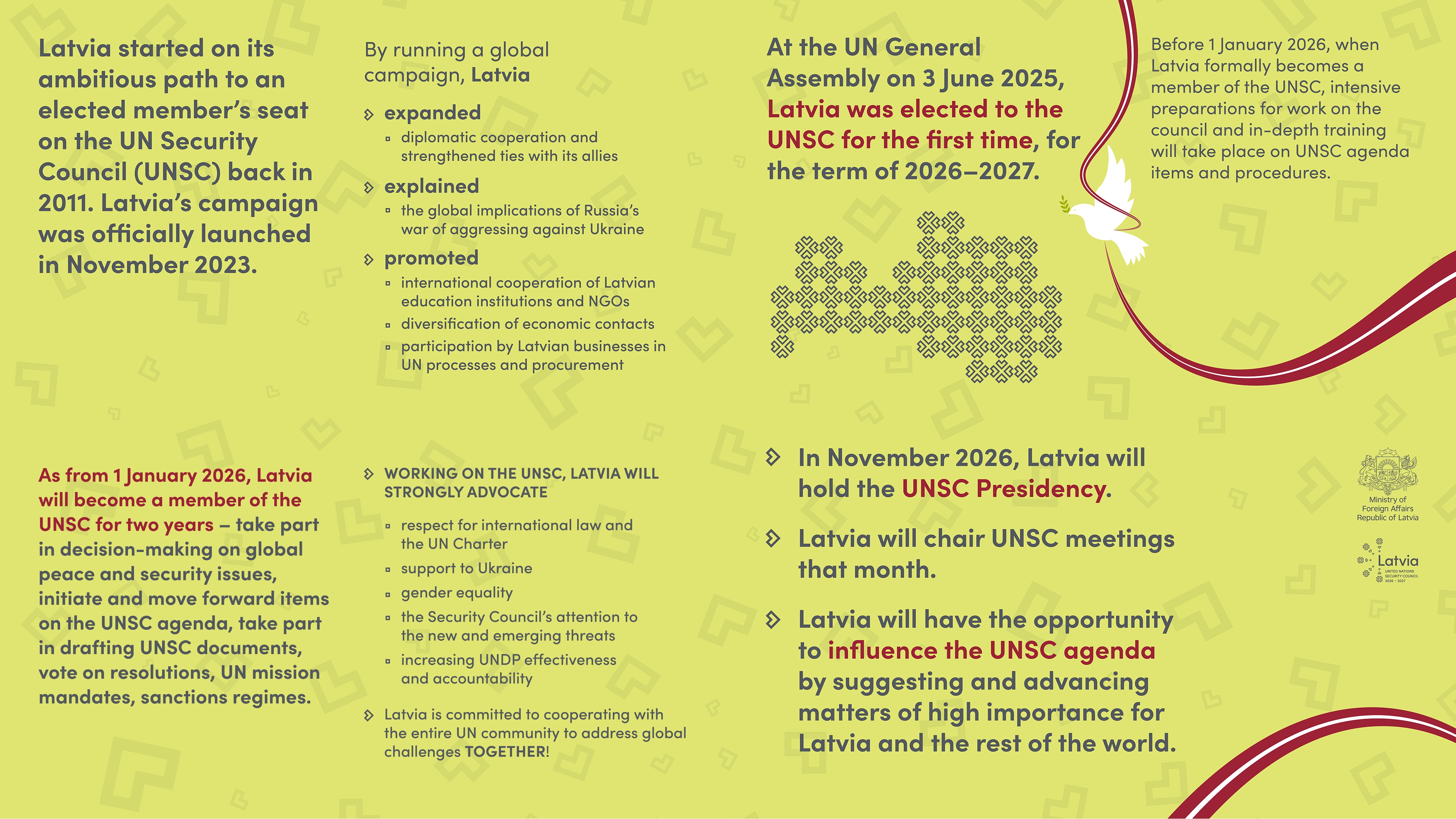 Latvia nominated its candidacy for the UN Security Council in 2011. Latvia’s global campaign “Together for Peace and Resilience” launched in 2023 has made it possible to explain the position of Latvia and our allies on Russia’s war of aggression against Ukraine, the violations of international law and disinformation through reaching out to countries all over the world, including in Africa, Asia, Latin America and the Caribbean, beyond the usual bilateral, multilateral and international formats such as the EU, NATO. It has succeeded in expanding Latvia’s diplomatic cooperation network and strengthening ties with strategic allies – the USA, the United Kingdom, France, and others. The participation of Latvian businesses in UN processes and procurements has also been promoted: for example, in 2023 Latvian companies sold goods and services worth USD 12.5 million to the UN and its agencies.