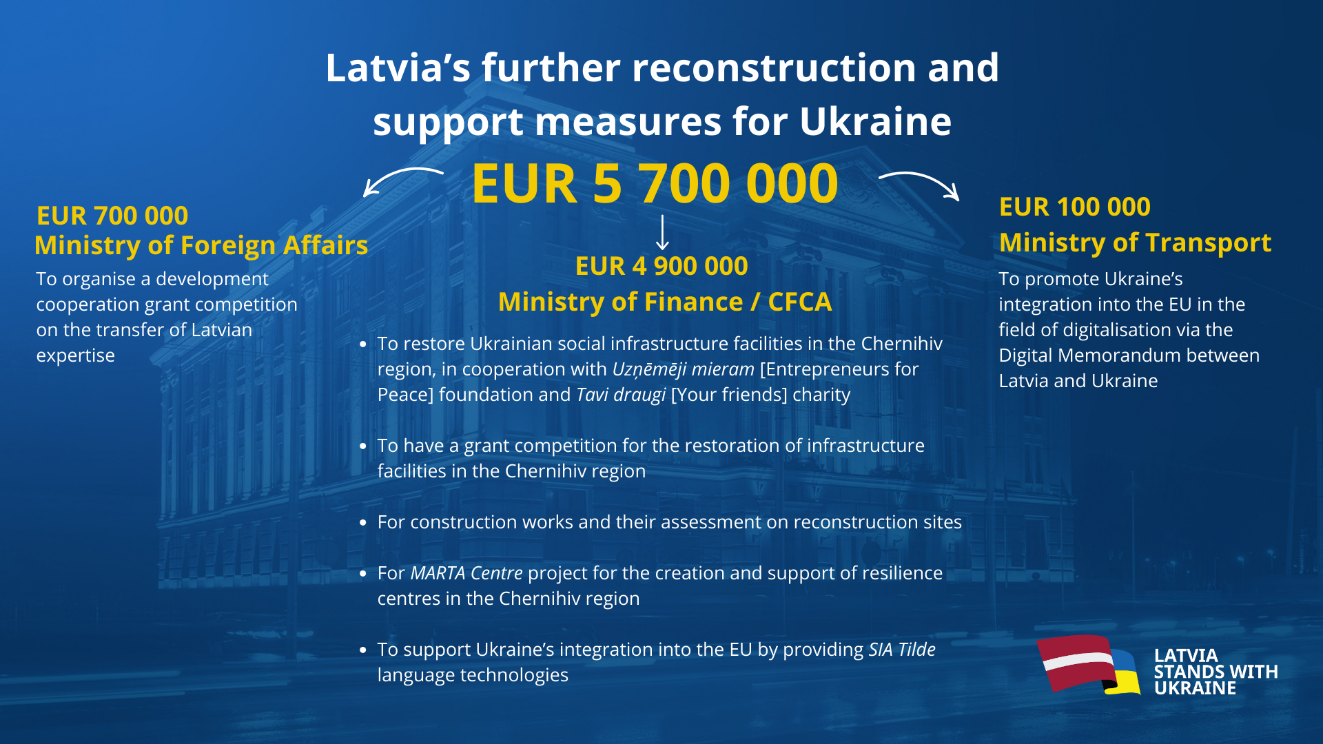 - Since the autumn of 2022, Latvia has been supporting the reconstruction of Ukraine, especially the Chernihiv region, by engaging in the restoration of social infrastructure and thereby improving the quality of life of the Ukrainian people.