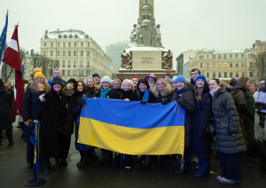 A joint photo of colleagues from the Ministry of Foreign Affairs and employees of the Ukrainian Embassy on February 24, the day marking four years since Russia began a full-scale war in Ukraine. Photo: Zane Bitere, LETA.