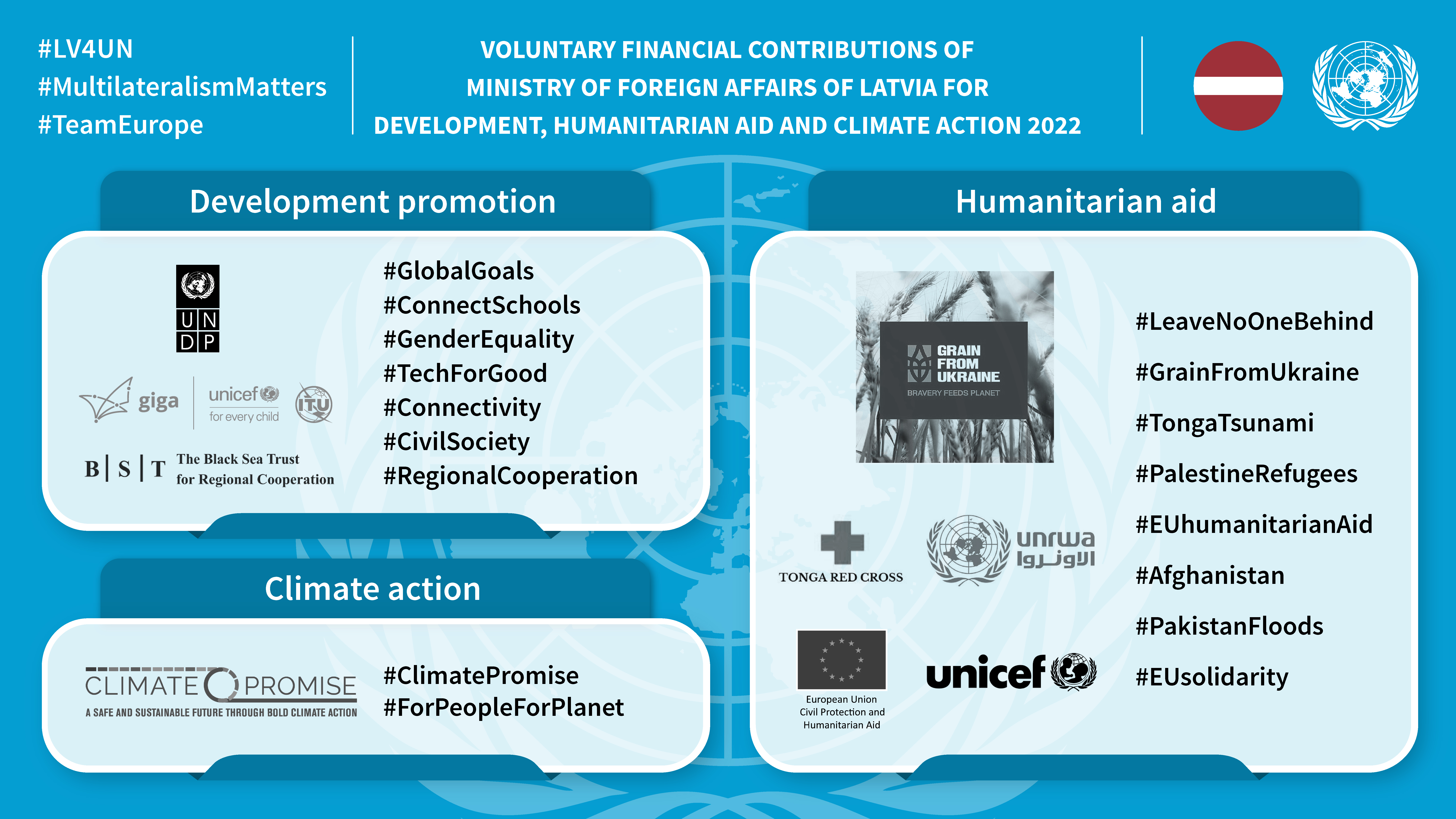 In 2022 Latvia has made voluntary contributions to 25 international organisations and funds demonstrating its solidarity with the UN system and regional partners. Contributions are made in line with Latvia’s priorities - ensuring peace and security, protecting human rights, advancing gender equality, promoting media and information literacy, ensuring sustainable development and providing humanitarian assistance.