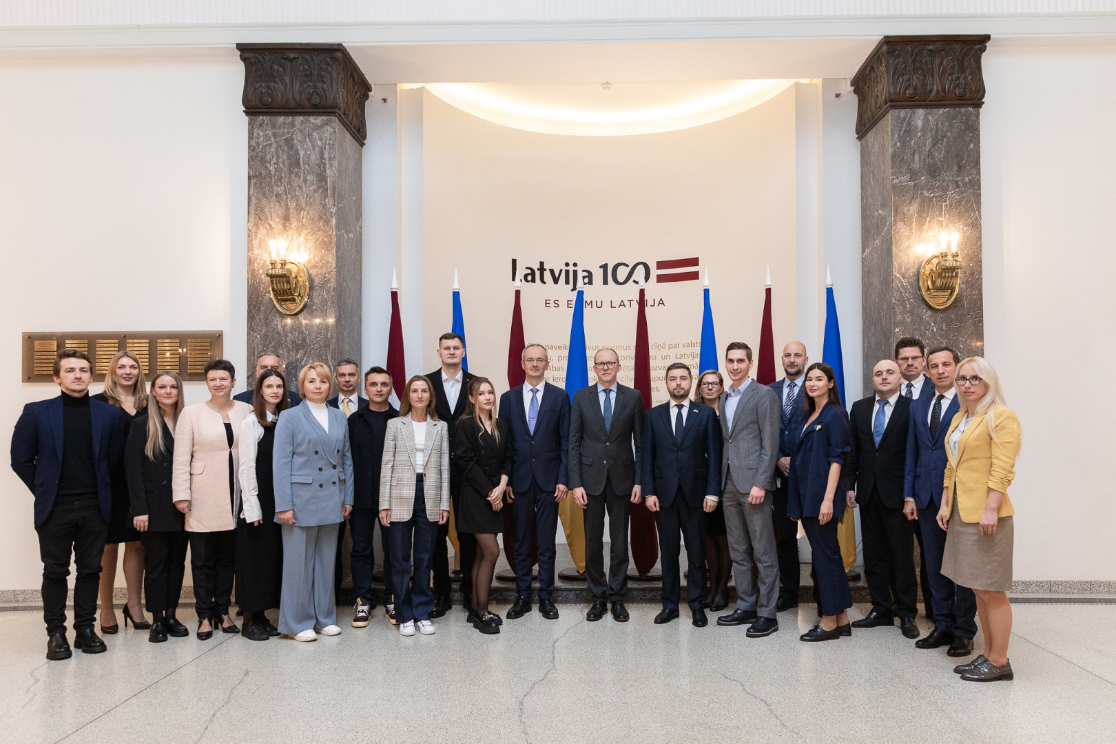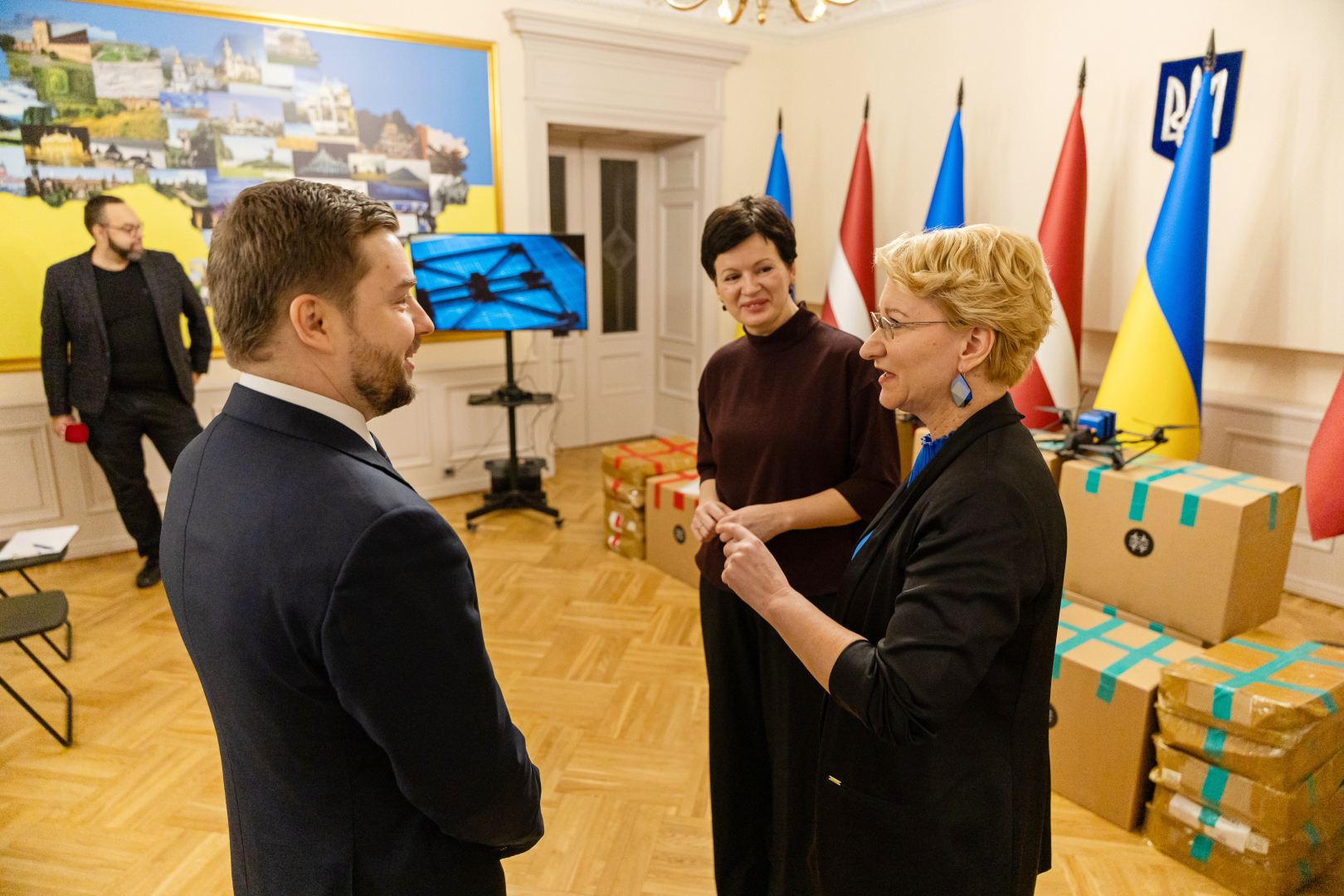 On Monday, 3 February 2025, the Parliamentary Secretary, Dace Melbārde, took part in an official event hosted by the Embassy of Ukraine, at which 100 Latvian drones were handed over to the Armed Forces of Ukraine in the presence of the Ukrainian Ambassador to Latvia Anatolii Kutsevol. The event was also attended by CEO of the charity organisation Ziedot.lv, Rūta Dimanta. The project was initiated by the Minister for Foreign Affairs in cooperation with the Ukrainian Embassy in Latvia. Photo: Laura Celmiņa, Ministry of Foreign Affairs.