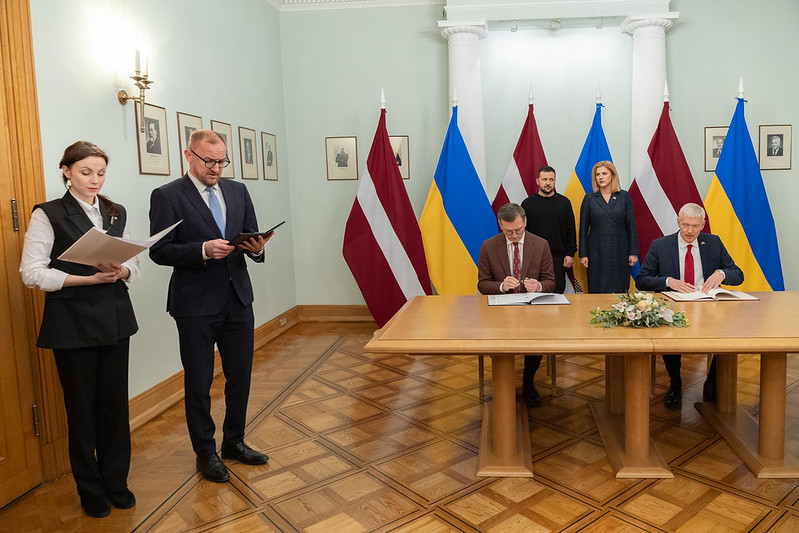 On 11 January 2024, the Minister of Foreign Affairs of Latvia, Krišjānis Kariņš, and the Minister of Foreign Affairs of Ukraine, Dmytro Kuleba, in the presence of the Prime Minister of Latvia, Evika Siliņa, and the President of Ukraine, Volodymyr Zelenskyy, signed an Agreement between the Government of the Republic of Latvia and the Cabinet of Ministers of Ukraine on Technical and Financial Cooperation. Photo: Laura Celmiņa, Ministry of Foreign Affairs.