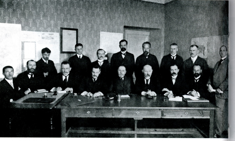 Latviešu bēgļu apgādāšanas centrālkomiteja. Kārlis Zariņš - pie galda pirmais no kreisās. Petrograda, 1915 – 1918 |