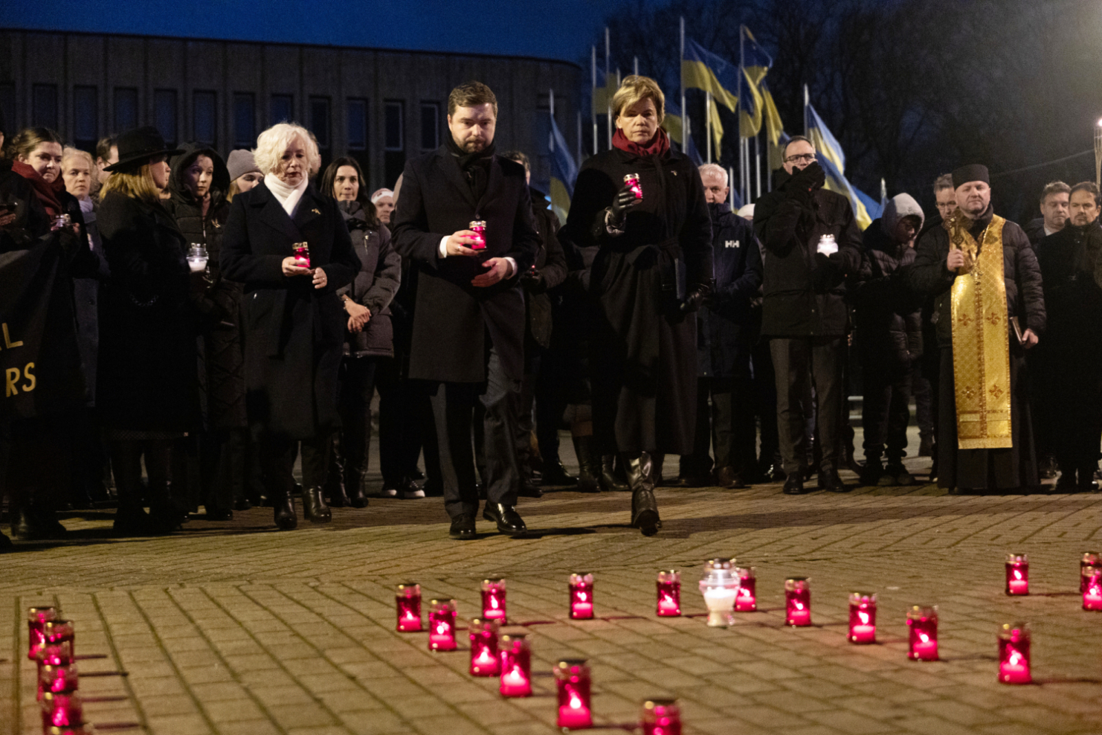 Pieminot 3. gadadienu kopš Krievijas pilna mēroga iebrukuma Ukrainā, 2025. gada 24. februārī pie Brīvības pieminekļa noris akcija "Kopā līdz uzvarai!". Foto: Laura Celmiņa, Ārlietu ministrija.