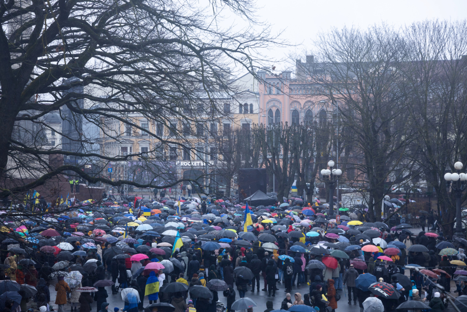 Pieminot 2. gadadienu kopš Krievijas pilna mēroga iebrukuma Ukrainā, 2024. gada 24. februārī pie Brīvības pieminekļa noris akcija "Kopā līdz uzvarai!". Foto: Laura Celmiņa, Ārlietu ministrija.