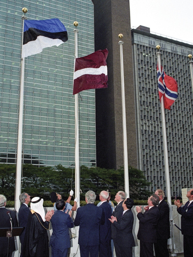 Karoga pacelšanas ceremonija Apvienoto Nāciju Organizācijas galvenajā mītnē Ņujorkā. 1991. gada 17. septembrī Latvija kļuva par pilntiesīgu ANO dalībvalsti.