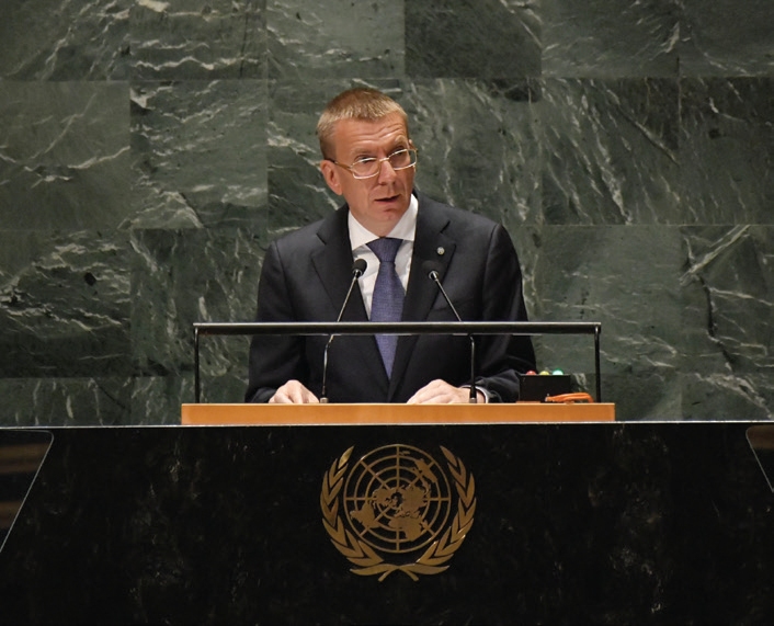 Latvijas Valsts prezidents Edgars Rinkēvičs uzrunā ANO Ģenerālo asambleju 2023. gada 22. septembrī.