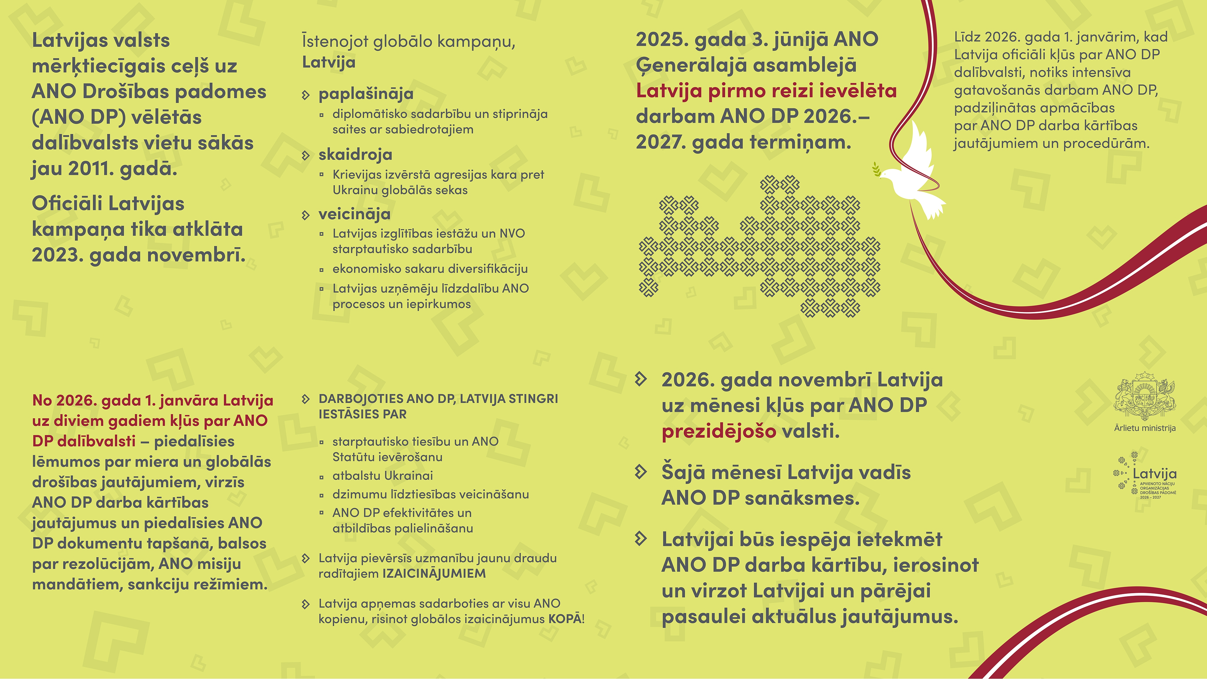 Strādāsim ANO Drošības padomē, lai palīdzētu panākt taisnīgu un ilgtspējīgu mieru Ukrainā, Tuvajos Austrumos un citos konfliktu reģionos, stiprinātu globālo drošību, aizsargātu starptautiskos noteikumos balstītu kārtību atbilstoši ANO Statūtiem, kā arī lai pilnveidotu ANO Drošības padomes darbu.”