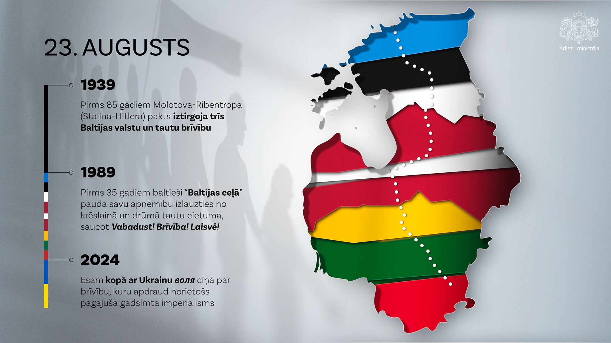 Pirms 35 gadiem, 1989. gada 23. augustā, Latvijas, Lietuvas un Igaunijas iedzīvotāji apvienojās vēl nebijušā un ļoti drosmīgā akcijā – Baltijas ceļā. Atzīmējot šo vēsturiski nozīmīgo notikumu, kā Latvijā, tā ārvalstīs notiek dažādi atceres pasākumi.