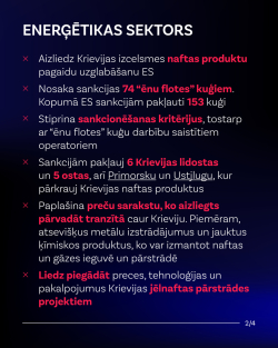 Apritot trešajai gadskārtai, kopš Krievija sāka brutālo agresijas karu Ukrainā, 24. februārī Eiropas Savienības (ES) Ārlietu padomē ministri apstiprināja ES sankciju pret Krieviju 16. kārtu, kas stiprina sankcijas un mazina iespējas tās apiet. Sankciju kārta ietver visaptverošus un mērķētus sektorālus pasākumus, lai ierobežotu Krieviju: aizliedz Krievijas izcelsmes naftas produktu pagaidu uzglabāšanu ES; ierobežo Krievijas izcelsmes neapstrādāta alumīnija importu; sašaurina iespējas eksportēt uz Krieviju divējāda lietojuma un militārai industrijai nepieciešamās preces; nosaka sankcijas vēl 74 “ēnu flotes” kuģiem (kopumā ES sankcijām tagad pakļauti 153 kuģi); sankcijām pakļauj 6 Krievijas lidostas un 5 ostas, arī Primorsku un Ustjlugu, kur pārkrauj Krievijas naftas produktus; 13 Krievijas bankām aizliedz izmantot SWIFT datu apmaiņas sistēmu; translācijas liegums 8 propagandas “medijiem”; individuālas sankcijas 83 personām (48 fiziskām un 35 juridiskām); sankcijām pakļauj 55 kompānijas (arī no Honkongas, Ķīnas, Turcijas, Apvienotajiem Arābu Emirātiem un Indijas), kas saistītas ar sankciju apiešanu. Lai novērstu sankciju apiešanu, vairākus Krievijas sankciju elementus salāgo ar sankcijām pret Baltkrieviju.