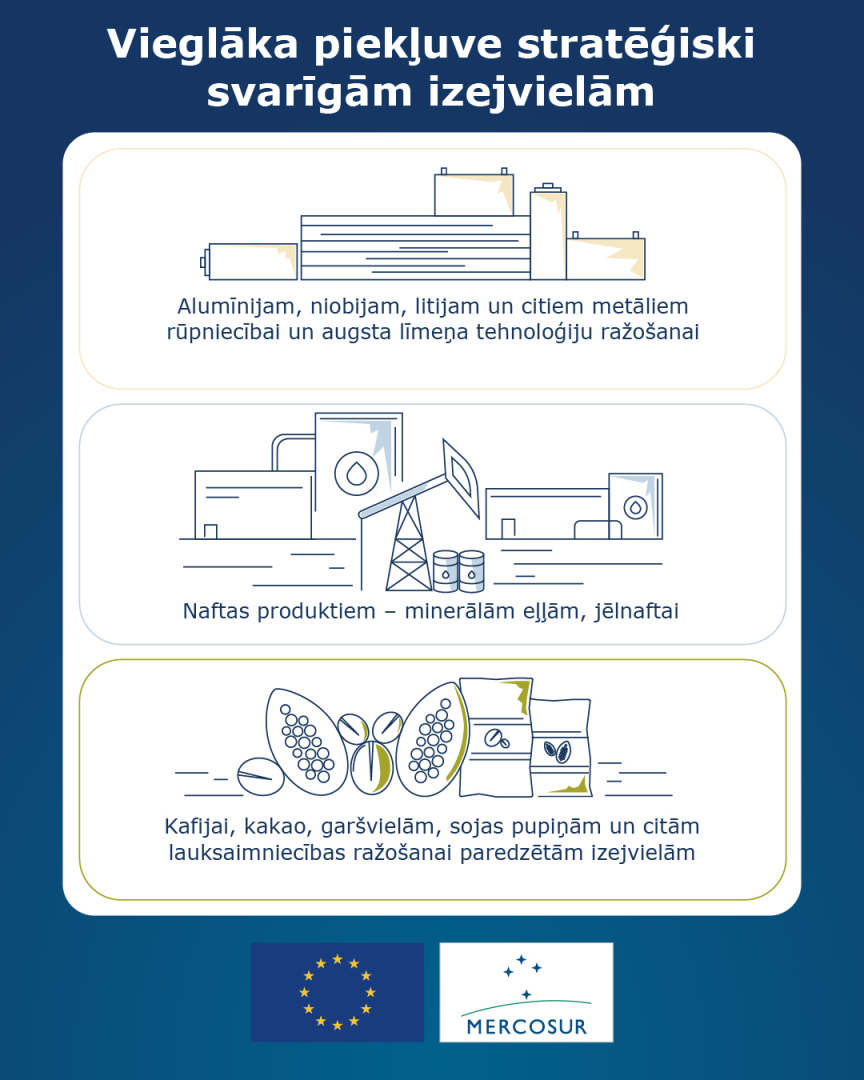 - Nolīgums Latvijas uzņēmējiem ļaus iesaistīties globālajās piegāžu ķēdēs, sadarbojoties ar citu ES dalībvalstu partneriem, kuri jau eksportē uz šo reģionu. Mercosur valstis arī atvērs savus publisko iepirkumu tirgus un samazinās šķēršļus telekomunikāciju, transporta un finanšu pakalpojumu sektoros.