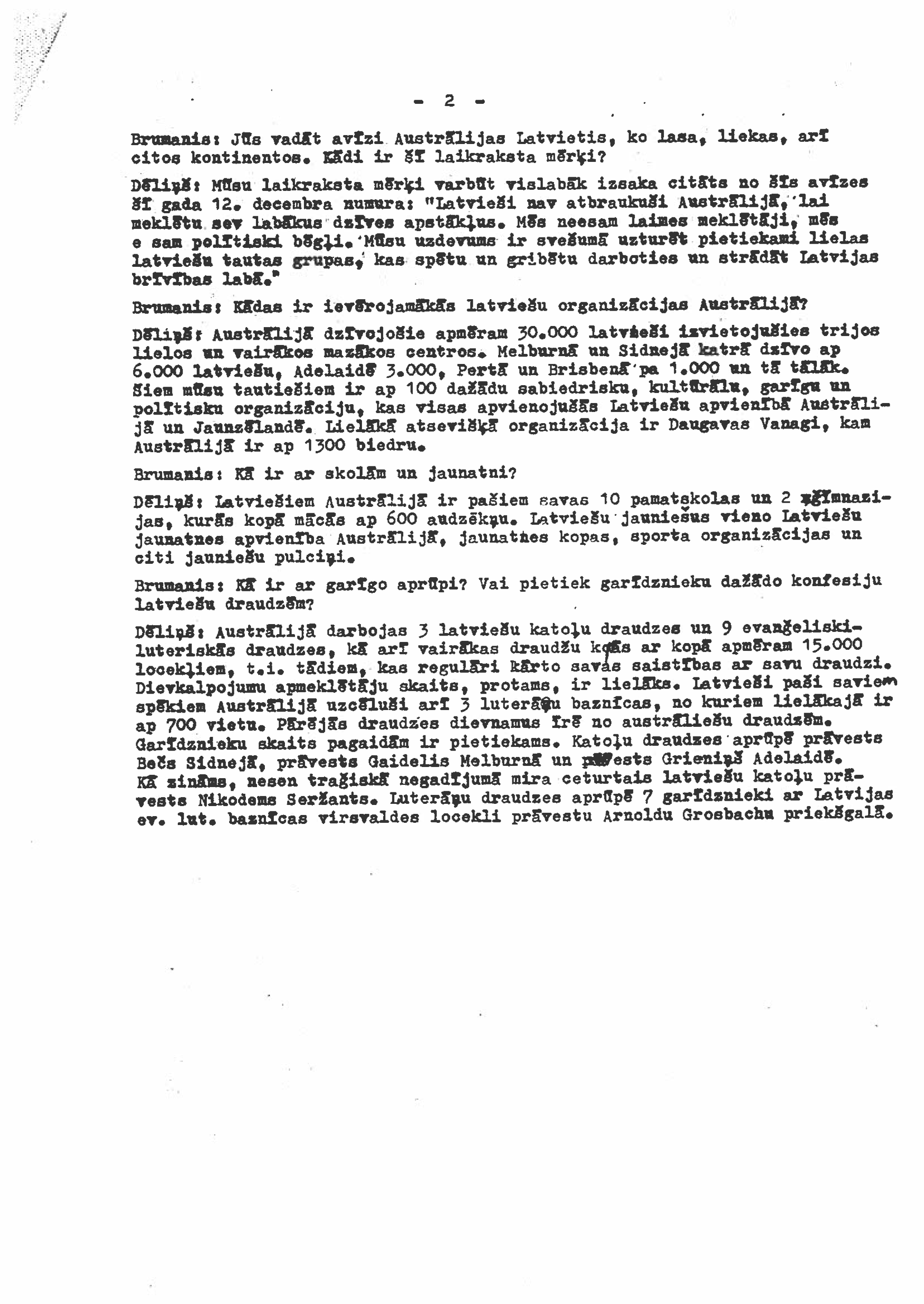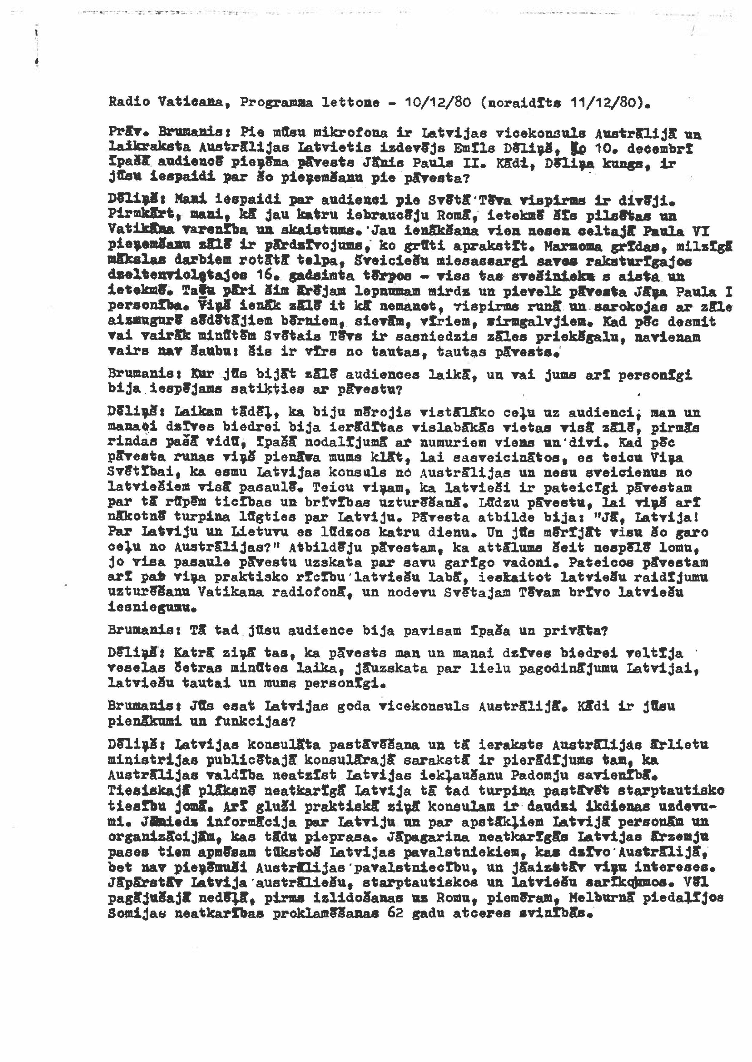 Goda vicekonsula Emīla Dēliņa intervijas Vatikāna radio noraksts. 1980. gada 10. decembris. Goda ģenerālkonsulāta Melburnā arhīvs