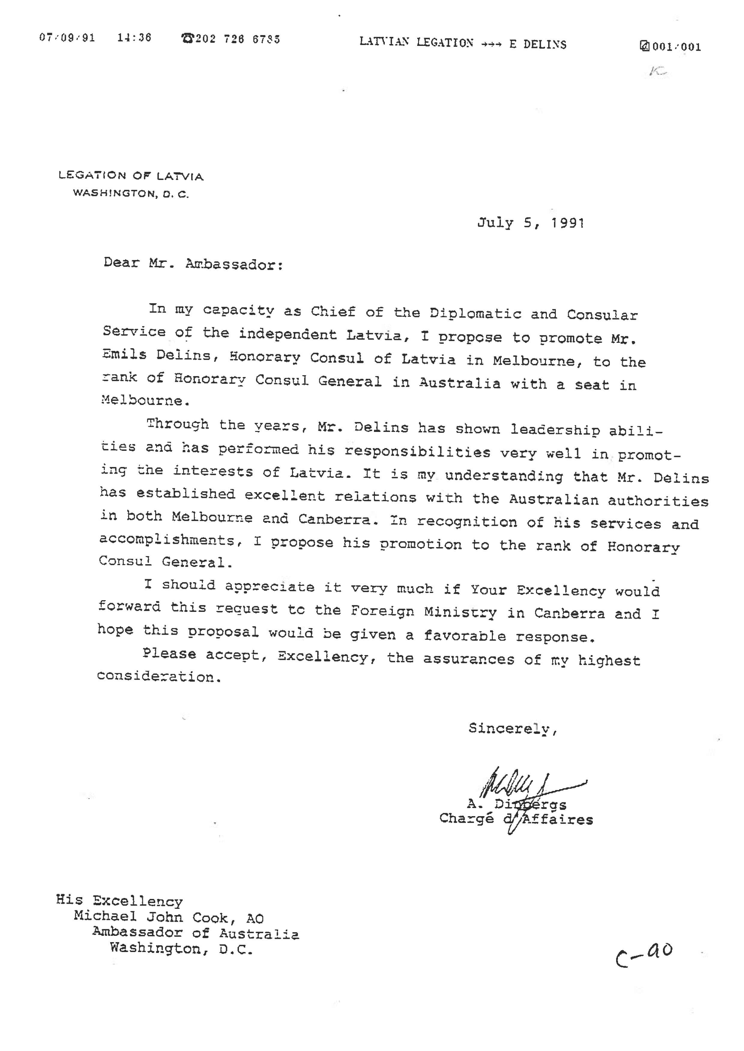 Latvijas diplomātiskā un konsulārā dienesta vadītāja Anatola Dinberga ierosinājums iecelt Emīlu Dēliņu par goda ģenerālkonsulu Austrālijā. 1991. gada 5. jūlijs. Goda ģenerālkonsulāta Melburnā arhīvs