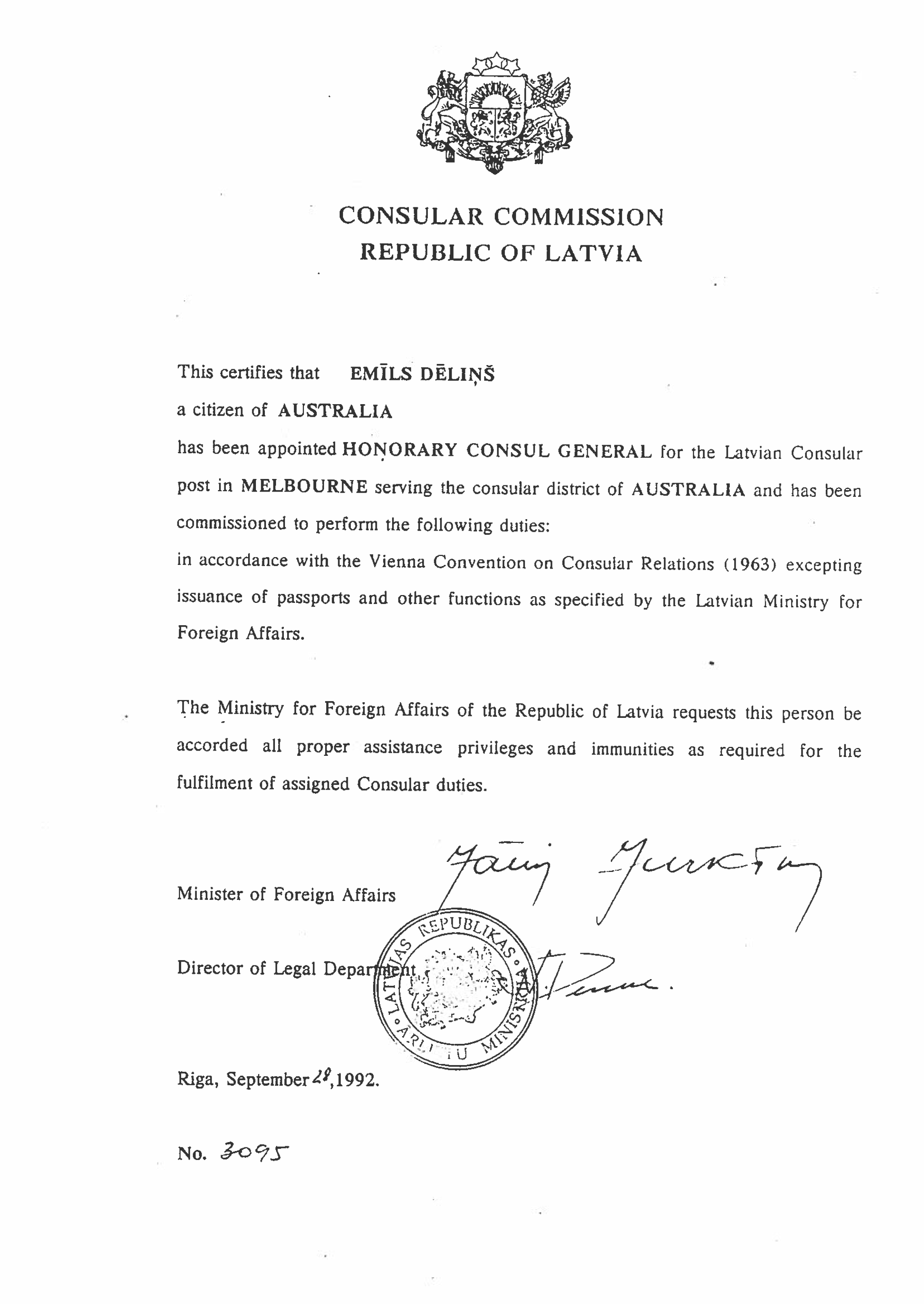 Latvijas Republikas ārlietu ministra Jāņa Jurkāna parakstīts konsulārais patents Emīlam Dēliņam – goda ģenerālkonsulam Melburnā, Austrālijā. 1992. gada 28. septembris. Ārlietu ministrijas arhīvs