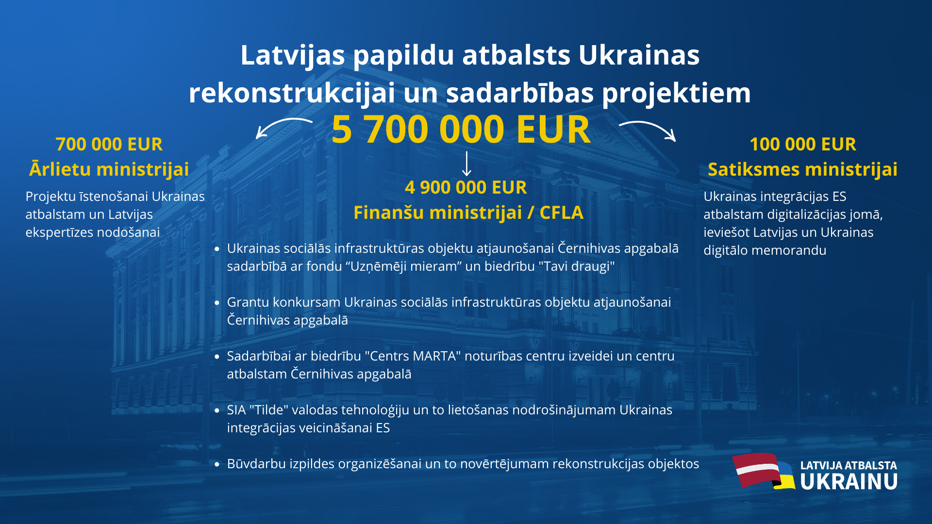 - Latvija jau kopš 2022. gada rudens atbalsta Ukrainas, it īpaši Černihivas apgabala rekonstrukciju, iesaistoties sociālās infrastruktūras atjaunošanā, tādējādi uzlabojot Ukrainas iedzīvotāju dzīves kvalitāti.