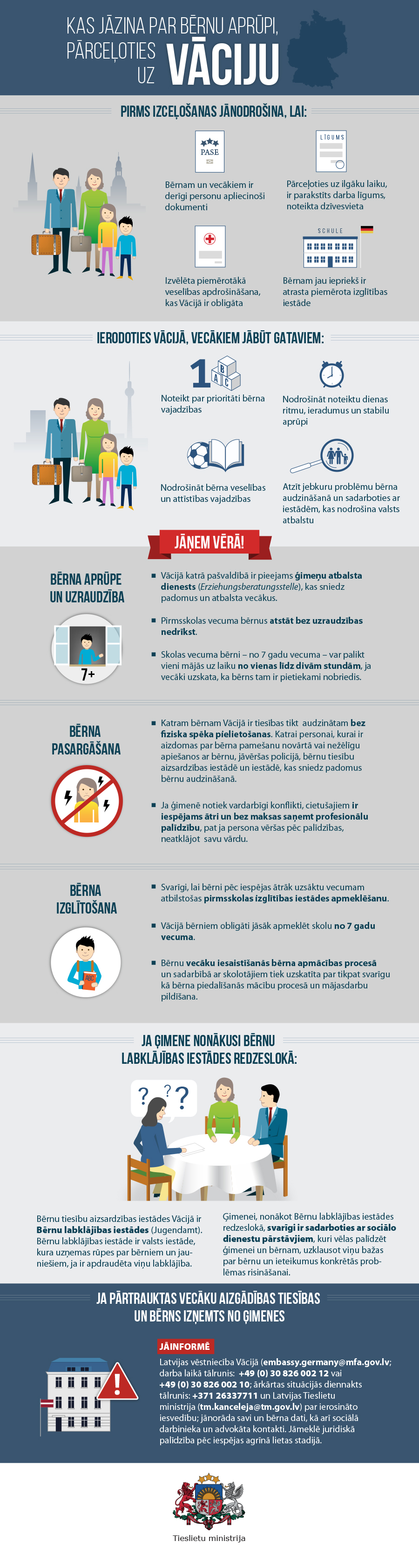 Izvērtējot iespēju pārcelties uz dzīvi citā valstī kopā ar nepilngadīgiem bērniem, vecāku pienākums ir rūpīgi pārdomāt bērnu aprūpes, izglītības un socializēšanās iespējas ārvalstī. Tā kā citā valstī vispārpieņemtās uzvedības un bērnu audzināšanas normas un tradīcijas var būtiski atšķirties no Latvijā pierastajām, aicinām pirms pārcelties uz dzīvi citā valstī, iepazīties ar konkrētās valsts kultūru, tradīcijām un paražām, kā arī ievērot mītnes valsts likumus.