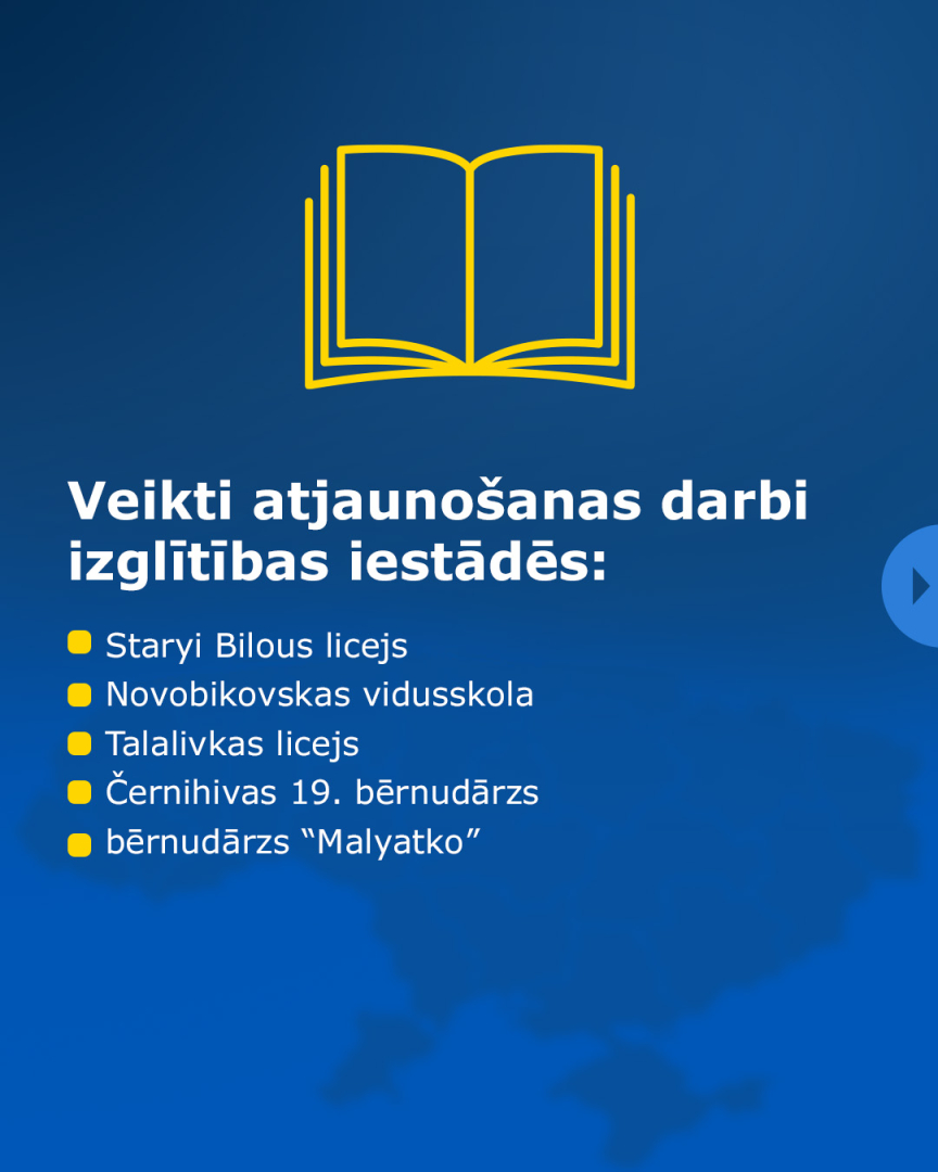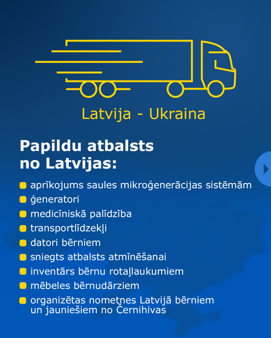 Latvija jau kopš 2022. gada rudens atbalsta Ukrainas, it īpaši Černihivas apgabala rekonstrukciju, iesaistoties sociālās infrastruktūras atjaunošanā, tādējādi uzlabojot Ukrainas iedzīvotāju dzīves kvalitāti.
